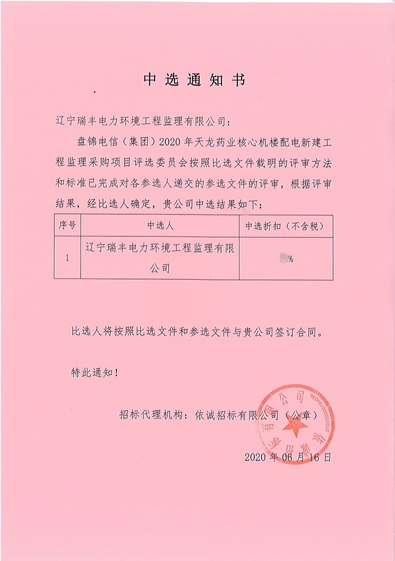 中標(biāo)喜訊-盤錦電信(集團)2020年天龍藥業(yè)核心機樓配電新建工程