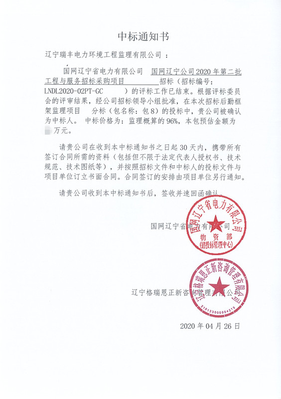 中標喜訊-國網(wǎng)遼寧公司2020年第二批工程與服務招標采購項目